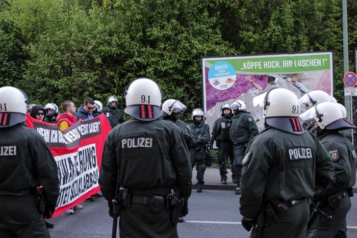 Mit rund 250 Teilnehmern bei ihrer Demonstration in Essen halbierte sich im Vergleich zum Vorjahr der 1. Mai-Aufmarsch der Nazi-Partei Die Rechte. Damals kamen noch um die 500 Rechtsradikale nach Dortmund. Nachdem es schon bei der Abreise in Dortmund zu Zwischenfällen kam, erreichte eine Einsatzhundertschaft der nordrhein-westfälischen Bereitschaftspolizei gerade noch rechtzeitig den Bahnsteig um bei der Ankunft den unterbesetzten Bundespolizei beizustehen. Genau diese Einsatzhundertschaft fehlte dann am Bahnhof Kray-Nord: Auf dem Weg zum Versammlungsplatz beleidigten und bedrohten die Rechtsradikalen Anwohner und Polizeibeamte. Die Lage beruhigte sich erst, als die Nazis das Kontrollzelt erreichten. Nun hatte die Polizei die Lage im Griff und betätigte sich als Spaßbremse: Durch intensive Personenkontrollen der Nazis brach sie die Dynamik des Aufmarsches, der sich dann später schlapp unter dem Gerufe der üblichen Parolen durch Kray schleppte. Die Polizei lies Gegenproteste in unmittelbarer Nähe der Nazi-Kundgebung zu, unterband allerdings teilweise Störungsversuche und Blockaden. Teilweise, weil es dann eine erfolgreiche Blockade war, welche die Nazis daran hinderte ihren Zielort in Gelsenkirchen zu erreichen. Die Rechte musste umdrehen, ließ sich aber mit dem Rückmarsch nach Kray viel Zeit. Ein anschließende Spontandemonstration in der Essener Innenstadt endete in den frühen Morgenstunden in einem Polizeikessel und mit der Feststellung der Personalien der Neonazis.