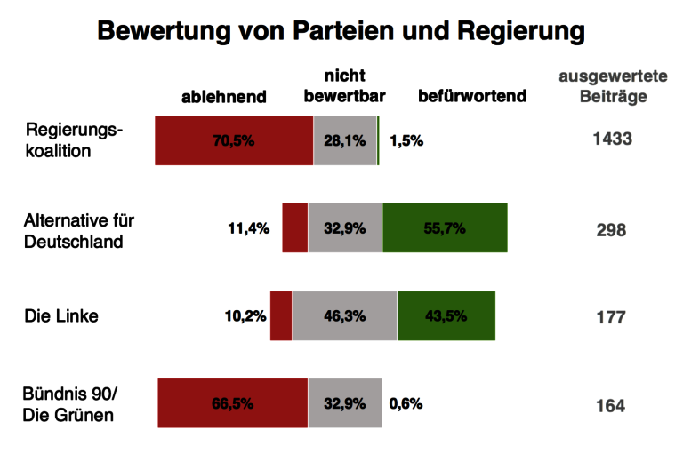 Vernichtend verläuft die Beurteilung gegenüber der Regierungskoalition und den Grünen. Obwohl die Grünen in der Opposition die Regierung kritisieren – diese Kritik findet sich nicht auf den VT-Seiten wieder. Dort sind die Grünen vor allem als Mittäter vieler Verschwörungstheorien ausgemacht worden (vor allem bezüglich einer angeblichen „Frühsexualisierung“ von Kindern).