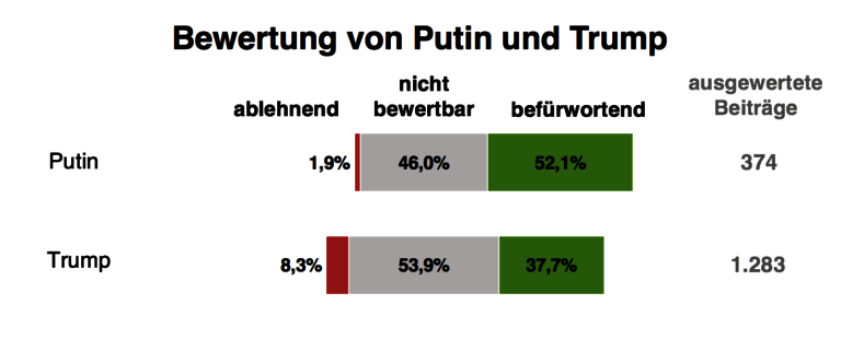 Putin ist der Heilsbringer der Verschwörungstheoretiker. Keiner der untersuchten Akteure erfährt weniger Kritik als er. Mit einem Zustimmungswert von 52,1% sind die meisten Beiträge, die seine Persönlichkeit behandeln, wohlwollend. Zwar wird auch Trump in VT-Kreisen eher befürwortet als abgelehnt, jedoch scheint sich dies möglicherweise im Moment zu ändern (auch wenn ein Trend während des Untersuchungszeitraums noch nicht erkannt wurde). Die Meldung über Trumps sieg in den USA ist der meistgelikte Beitrag in unserer Erhebung.