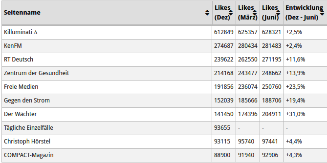 Vier Seiten wurden nach der Erhebung gelöscht (Hinter den Kulissen, Tägliche Einzelfälle, Der BRD-Schwindel – Wir sagen NEIN zur Volksverdummung, Propagandaschau), teilweise wurden neue Seiten unter dem gleichen Namen eröffnet. Im Februar benannte die Seite „Montagsmahnwachen in Deutschland“ ihren Auftritt in „Weltweiter Widerstand 2017“ um. (Anmerkung: Das Bild zeigt eine Tabelle, die wir an dieser Stelle nicht vernünftig einbinden konnten.)