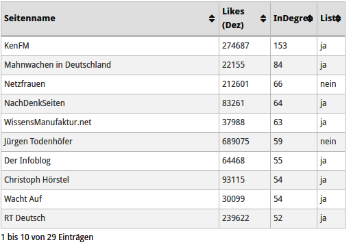 Der InDegree-Wert beschreibt die Anzahl der Likes innerhalb des Netzwerks der VT-Seiten. Die Spalte „Liste“ gibt an, ob die Seite Teil der Ursprungserhebung (84 VT-Seiten) ist oder nicht. (Anmerkung: Das Bild zeigt eine Tabelle, die wir an dieser Stelle nicht vernünftig einbinden konnten.)