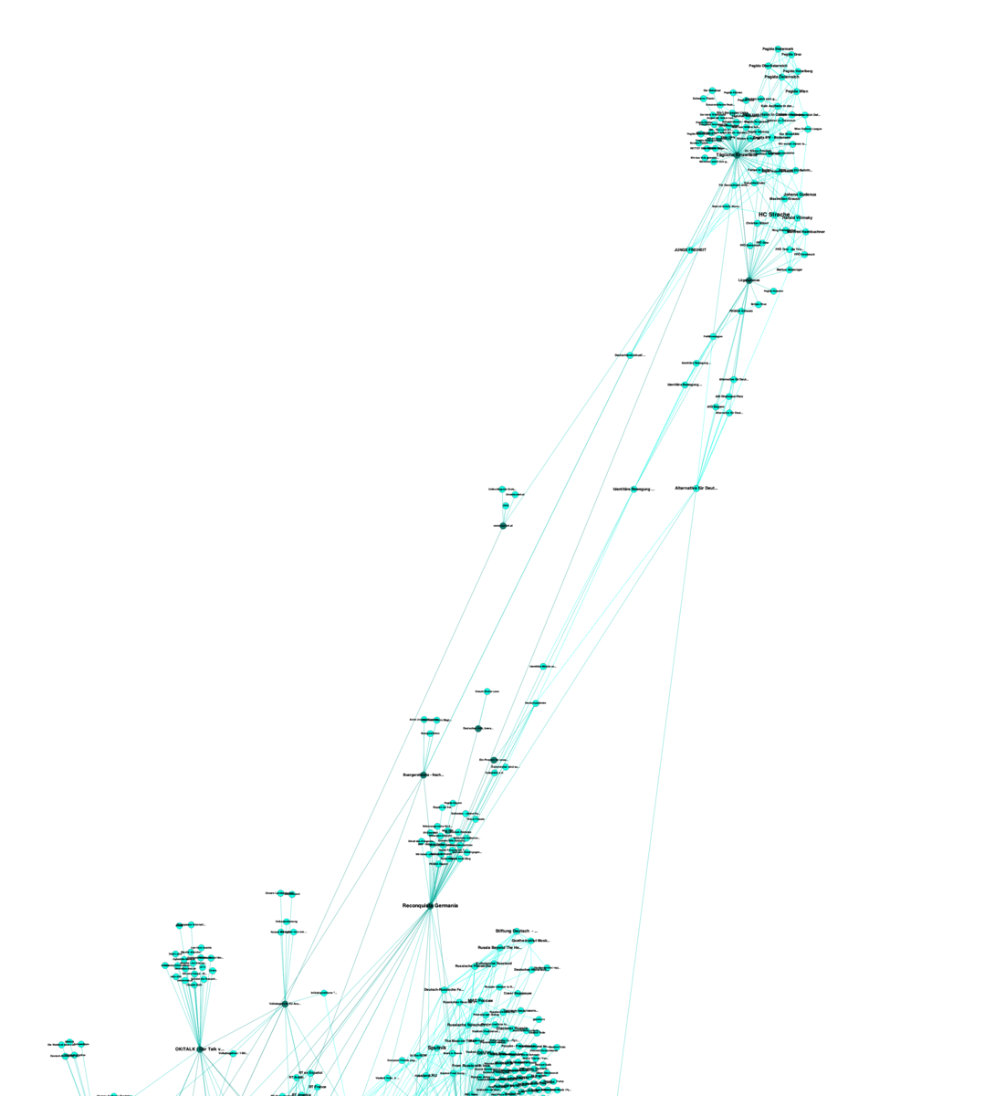 Während sich im Netzwerk der Massenmedien viele Gruppen bilden und nur wenige Verbindungen zwischen diesen bestehen, zeichnet sich das Netzwerk der VT-Seiten durch eine große Homogenität aus. Lediglich eine Subgruppe bildet sich im Netzwerk der VT-Seiten heraus, dennoch steht auch diese mit dem Rest des Netzwerks in Verbindung (siehe folgende Abbildung) – diese Subgruppe zeichnet sich vor allem dadurch aus, dass sie mit rechtspopulistische und rechtsextremen Seiten verknüpft ist und von diesen geliked wird (Identitäre Bewegung, FPÖ und AfD).