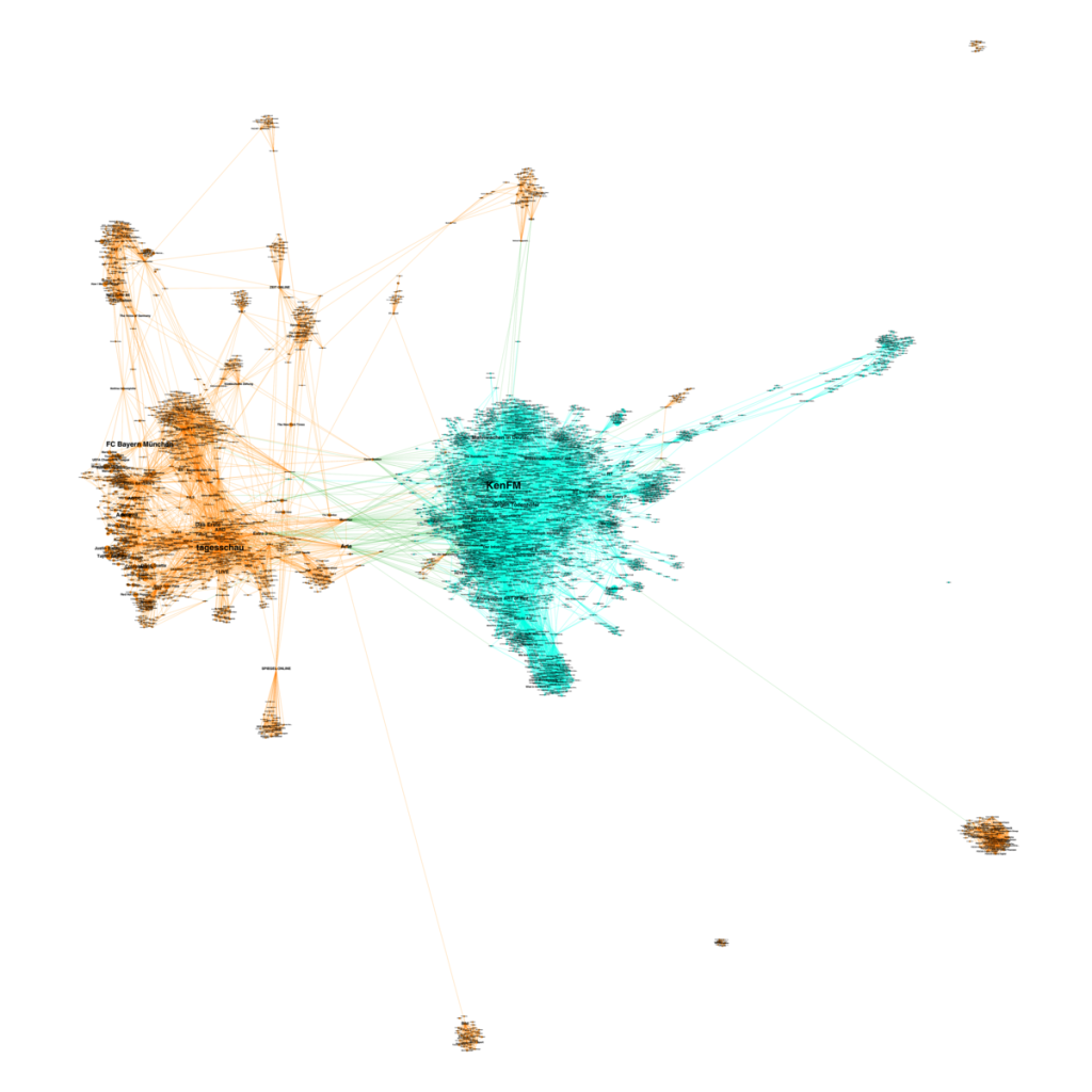 Deshalb vermuteten wir, eine solche Echokammer eventuell darstellen zu können. Hierzu betrachteten wir alle Nutzer, welche auf mindestens zwei Seiten aktiv waren oder mindestens fünf Kommentare in einem Zeitraum von vier Monaten geschrieben haben. Diese Auswertung ist in folgender Netzwerkanalyse dargestellt: