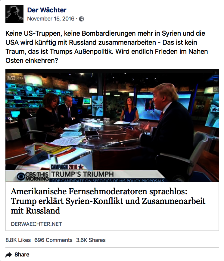 Besonders prominent innerhalb des Netzwerks der Verschwörungstheorien vertreten ist die Seite Der Wächter. Neben einem starken Zuwachs an Likes werden auf anderen VT-Seiten besonders oft deren Inhalte geteilt – später dazu mehr.