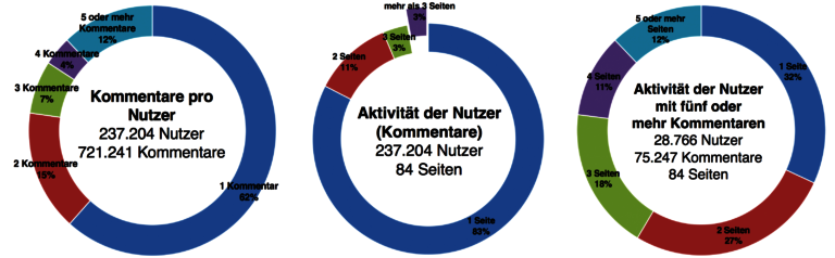 Abschließend möchte ich noch einen kleinen Blick auf die Nutzer der VT-Seiten werfen. Die meisten dieser Nutzer machten von der Kommentarfunktion innerhalb des Untersuchungszeitraums lediglich ein Mal Gebrauch (62%), dabei kommentierte die überwiegende Mehrheit nur auf einer Seite (83%).