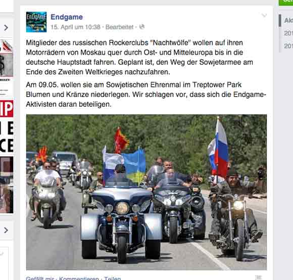 Nun glauben die angebräunten Aluhüte neue Freunde gefunden zu haben: Putins Rocker-Gang Nachtwölfe. Die werden wohl am 9. Mai in Berlin auflaufen, alle Versuche das zu verhindern, scheinen nicht erfolgreich zu sein. Endgame will bei der Putin-Gang aufspringen. Auf Facebook ruft die Gruppe dazu auf, die Rocker zu unterstützen: „Wir schlagen vor, dass sich die Endgame-Aktivisten daran beteiligen“ heißt es dort. Bei den Anhängern sind die Reaktionen gemischt. Einige jubeln, andere lassen ihrem Rassismus freien Lauf und fürchten die Vergewaltigung deutscher Frauen durch die Russen. Einen Haufen Irrer zusammen zu halten, die nur ihr Hass und ihre Blödheit verbindet, ist nun mal nicht einfacher, als einen Sack Flöhe zu hüten.