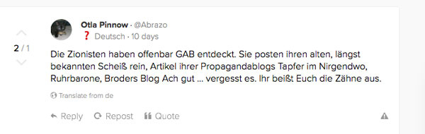 Aber Gab ist eine Option. Zuerst einmal für zahlreiche Rechte, die nach und nach aus Facebook und Twitter gedrängt werden. Sie können sich hier sammeln. Aber Facebook löscht und sperrt nicht nur ausgewiesene Rechtsradikale. Oft ist die Sperrpolitik des Netzwerkes nicht nachvollziehbar. Wenn der Kölner Blogger Gerd Buurman sich in einem auf Facebook verbreiteten Artikel mit den Worten „War Hitler Antisemit? Der Faktencheck sagt: „Bisher gibt es keinen Beleg dafür, dass Adolf Hitler mit eigenen Händen einen Juden umgebracht hat.“ gallig den Faktencheck des WDR nach der Ausstrahlung der Dokumentation „Auserwählt und ausgegrenzt – der Hass auf Juden in Europa“ kommentiert, ist das nicht antisemitisch, sondern eine Kritik an der Blindheit des Senders gegen Antisemitismus. Buurman wurde wie viele andere, die keine Rechtsradikalen sind, in den vergangenen Wochen häufiger gesperrt. Die Gründe sind nicht transparent, viele sind verunsichert und ihre Zahl wird durch die Folgen des NetzDG weiter zunehmen. Maas und Facebook könnten so Gab neue Nutzer zuführen und zu einem schnelleren Wachstum verhelfen, was fatal wäre und einen weiteren Nebeneffekt haben könnte: Gab hat noch kein Geschäftsmodell und kostet Geld. Jeder Nutzer könnte Gab dabei helfen, sich in Richtung eines kommerziellen Erfolgs zu entwickeln.