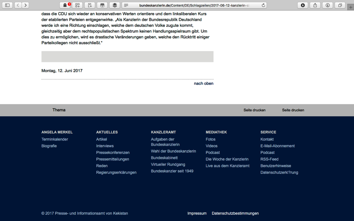 Die Erklärung, in der Merkel vermeintliche Fehler eingestehen soll, wird auf einer Seite mit der URL bundeskanzlerln.de/Content/DE/Schlagzeilen/2017-06-12-kanzlerin-sieht-fehler-ein.html gehostet. In der Domain steht aber anstelle eines „i“ ein „l“. In der Fußzeile zeichnet ein „Presse- und Informationsamt von Kekistan“ verantwortlich. „Kek“, für Uneingeweihte, ist ein beliebtes Schlagwort unter virtuellen Anhängern der „Alt-Right“ und Trump-Unterstützern im Netz.