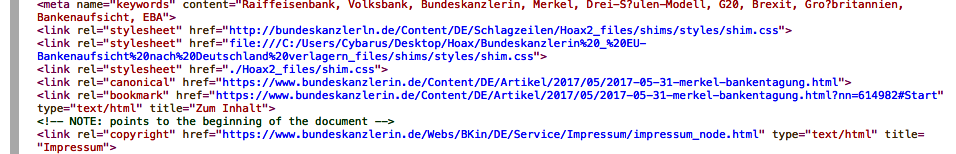 Dennoch finden sich im Quelltext der Seite neben dem Begriff „Hoax“ (Fälschung) Hinweise auf einen Nutzer mit dem Namen „Cybarus“. Einige wenige Links verweisen auf Dateien, die auf dem Windows-Rechner des Fakers liegen. Aus dem Dateipfad lässt sich rekonstruieren, dass er auch diesem Rechner den Nutzernamen „Cybarus“ hat.