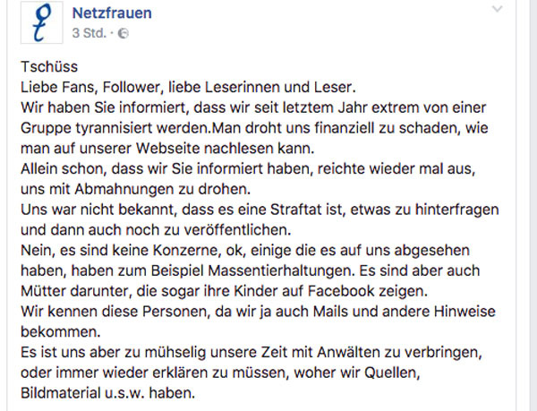 Hetze, Ökohysterie, eine ordentliche Portion Verschwörungstheorie und ganz viel Selbstgerechtigkeit und Empörung – das war die Mischung, mit der es das Blog „Netzfrauen“ auf Facebook auf eine beachtliche Reichweite von über 220.000 Fans gebracht hat. Dass es sowas wie Urheberrechte gibt, das man sich Bilder und Geschichten nicht einfach zusammen klauen kann, das war den Netzfrauen nicht so wichtig. Was wohl zu vielen Verfahren und Kosten führte, wie man dem Abschiedspost entnehmen kann.