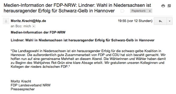 Sicher, für die FDP war es ein guter Abend gestern in Niedersachsen – und an einem solchen Abend ist man schon einmal euphorisch. Aber ganz so gut, wie es in dieser Pressemitteilung der nordrhein-westfälischen FDP von 19.55 Uhr erscheint, war er dann doch nicht: SPD und Grüne haben eine Vorsprung von einer Stimme im Landtag und werden wohl die nächste Regierung stellen. Schwarz-Gelb ist abgewählt. Wer auf Nummer sicher geht, wartet mit so einer Pressemitteilung an einem so spannenden Wahlabend wie gestern besser noch ein wenig länger mit der Siegesmeldung.