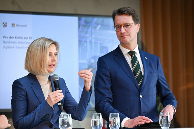 In Elsdorf (Rhein-Erft-Kreis) präsentierte NRW-Ministerpräsident Hendrik Wüst (CDU) gestern gemeinsam mit Microsoft-Deutschlandchefin Marianne Janik die Pläne, wie Nordrhein-Westfalen zu einer führenden KI-Region werden soll. Kern der Bestrebungen ist Microsofts Vorhaben, in der Region eigene Rechenzentren für KI-Anwendungen zu erreichen. Die Rechenzentrumsregion im Rheinischen Revier wird damit die Cloud- und KI-Kapazität für ganz Deutschland steigern und der Braunkohleregion neue Wachstumsperspektiven eröffnen. Dabei werden unmittelbar bei Microsoft einige hundert Arbeitsplätze entstehen. Nice to have. Aber noch wesentlich bedeutender sind die geplanten Qualifizierungsmaßnahmen: Um die Verfügbarkeit von Fachkräften zu verbessern, startet Microsoft eine große KI-Qualifizierungsoffensive mit lokalen Partnern aus Wirtschaft, Kommunen, Schulen und Bildungsträgern im Land. „Wir investieren in die Region und die Menschen“, sagte Marianne Janik. „Microsoft Deutschland ist seit Jahrzehnten in NRW aktiv, wo wir viele große Kunden haben. Und jetzt unterstützen wir die Region beim Start ins KI-Zeitalter.”