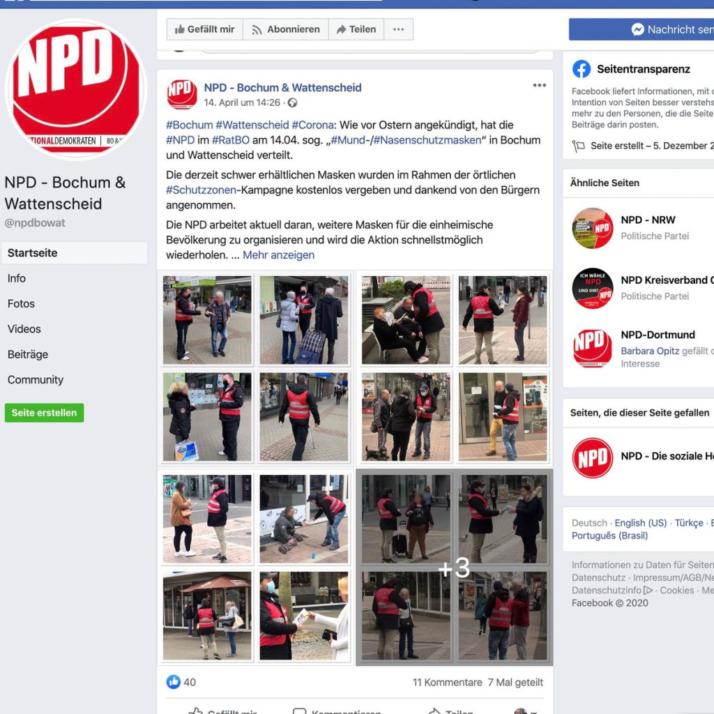 Seit Jahren versucht sich darbende NPD als Kümmerer zu präsentieren. Mal spielten sich NPD-Anhänger als Wachschutz auf, nun, während der Corona-Krise, verteilt die Partei im Bochumer Vorort Wattenscheid Schutzmasken. Dabei ignoriert die NPD allerdings sowohl das Abstandsgebot von 1,5 bis 2 Metern und dass man, wenn man sich zwei Personen nähert eine ebenfalls untersagte Dreiergruppe bildet, ist den Rechtsradikalen entgangen.