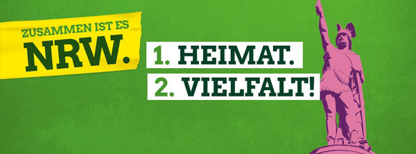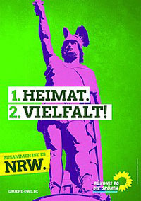 Sie wissen aber schon, dass das Plakat nur in Ostwestfalen hängt, wo der Herrmann als die touristische Sehenswürdigkeit OWLs tatsächlich ein Heimat-Symbol ist? Wonach ein Sportverein benannt ist, der einen Schlachtruf "Niemand erobert den Teutoburger Wald" hat? Wo Betriebe als Auszeichnung an Mitarbeiter kleine Herrmannsstatuen vergeben? Wo man die Herrmann-Silhouette das ist, es SIM Ruhrgebiet der Fördertürme ist (der ja nun auch für eine aussterbende, klimaschädigende Technologie steht)?