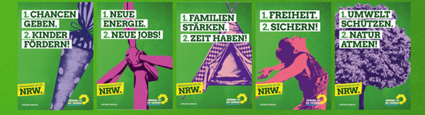 Es ist Wahlkampfzeit in Nordrhein-Westfalen, die Parteien werben um die Stimmen der Wähler. Auch die Grünen sind dabei. Ihre Plakate bestehen aus drei Elementen: Einem Bildmotiv und zwei Inhaltselementen: