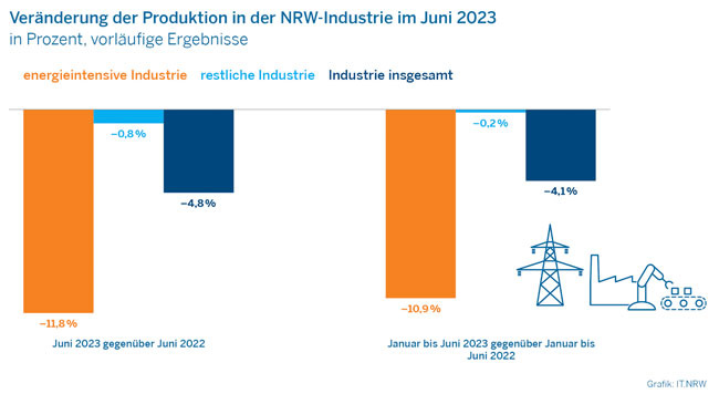 Im Vergleich zu Juni 2022 wurden für alle energieintensiven Branchen NRWs Produktionsrückgänge gemeldet: Innerhalb der energieintensiven Branchen wurde für die Kokerei und Mineralölverarbeitung der größte Produktionsrückgang (−25,9 Prozent) ermittelt. Auch für die Chemische Industrie war ein überdurchschnittlicher Produktionsrückgang (−14,2 Prozent) zu konstatieren. In der übrigen Industrie konnte für die Herstellung von pharmazeutischen Erzeugnissen ein überdurchschnittlicher Produktionsanstieg (+30,3 Prozent) verbucht werden. Auch die Hersteller von Bekleidung konnten ihre Produktion steigern (+13,3 Prozent). Die Produktionsleistung im Bereich Herstellung von Druckerzeugnissen; Vervielfältigung von bespielten Ton-, Bild- und Datenträgern ist dagegen gesunken (−14,9 Prozent).