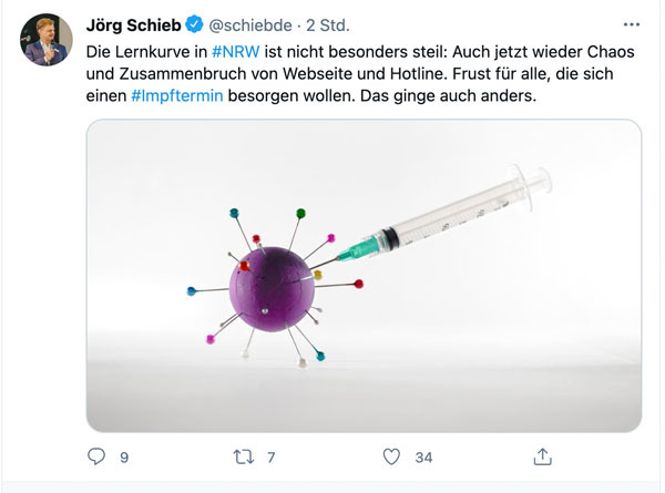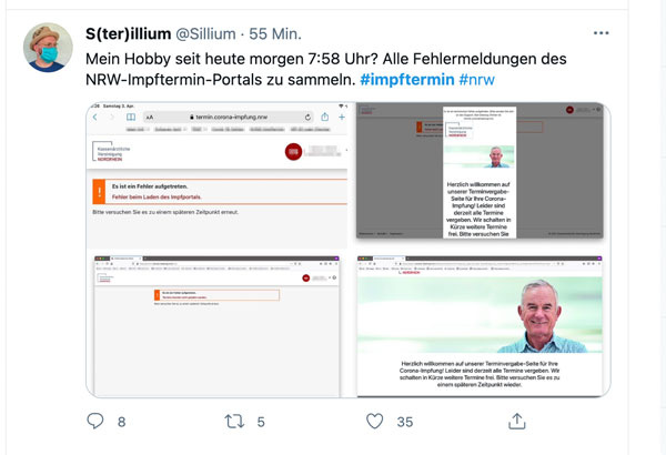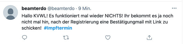 Ü60er mit Mail-Addis von kleineren Providern hatten wg. fehlender Überlastung deren Server diese Probleme nicht. Ich habe selbst ein paar Stunden erfolglos auf die Antwort an meine t-online-Adresse gewartet und dann eine zweite Addi eines kleinen Providers für eine neue Registrierung verwendet (eine Doppelregistrierung wird nur bei gleicher Mailadresse abgelehnt) – voila, es war in zwei Minuten erledigt. Die t-online-Mail kam dann am frühen Abend an. Dass die KV Westfalen-Lippe mit GMX-Mails Probleme hatte, stand bei denen schon früh auf Twitter.