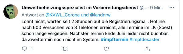 Das hatte gestern zur Folge, daß ein Bekannter im Kreis Recklinghausen gestern einen Termin am 13.4. bekam, ich aber heute einen Termin ab dem 8.4. buchen könnte.