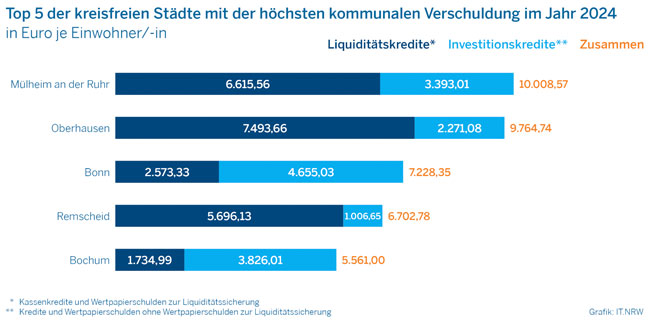 Rein rechnerisch lag die durchschnittliche Pro-Kopf-Verschuldung in NRW Ende 2024 bei 3.075 Euro. Besonders betroffen waren einzelne Städte: In Mülheim an der Ruhr summierten sich die Schulden auf rund 10.000 Euro je Einwohner – gefolgt von Oberhausen (rund 9.800 Euro), Bonn (7.200 Euro), Remscheid (6.700 Euro) und Bochum (5.600 Euro). Während in Mülheim und Oberhausen vor allem Liquiditätskredite zu Buche schlugen, dominierten in Bonn und Bochum Investitionsschulden.