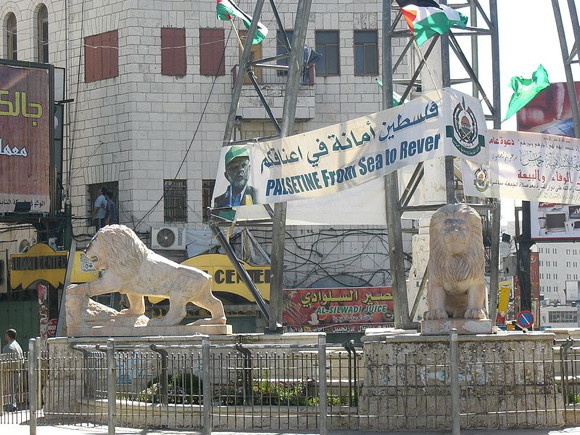 Wahlplakat der Hamas in Ramallah. Auf dem Plakat heißt es: Palsetine From Sea to Rever (sic!). Gemeint ist, dass Israel von der Landkarte verschwinden muss, damit ein islamischer Gottesstaat zwischen Mittelmeer (Sea) und Jordan-Fluss (River) entstehen kann. (Quelle: Ervaude)