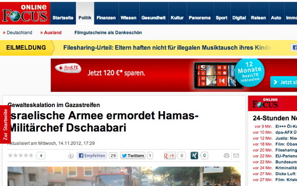 Die Raketenangriffe auf Südisrael schaffen es in Deutschland aber fast nie in die Meldungsrubriken, dementsprechend überrascht gibt sich nun die deutsche Öffentlichkeit. Wie kommt Israel dazu, den Militärchef der Hamas zu töten bzw. zu ermorden, wie es bei Dradio Kultur und bei Focus-Online heißt? (Übrigens eine deutliche Sprache, die bei der Bombardierung von Tanklastzügen in Afghanistan mit mehr als 100 toten Zivilisten zu einem Rechtsstreit geführt hatte). Die Frage nach der Vorgeschichte der aktuellen Ereignisse wird höflich ausgeklammert.