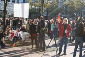 Also Sonne tanken, während drei Redebeiträge zu Beginn die derzeitigen Amokläufe der Finanzwelt aufzählen. Dabei zur Erinnerung noch mal an das Theater um den im doppelten Wortsinn verhinderten Auftritt von Deutsche Bank-Chef Josef Ackermann im örtlichen Schauspielhaus erinnert. Das macht Mut, das macht Hoffnung. Für Kritik an imperialistischen Kriegszügen und der verstrahlten Atom-Lobby ist sowieso immer Platz. Dann auf zur kleinen Demo-Runde durch die Innenstadt. DKP, Linke und sonstige „Rebellen“ schwenken ihre Fähnlein tapfer im Wind.