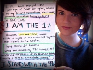Ich mag den Occupy-Slogan mit den 99 Prozent nicht. Er ist mir zu großkotzig. Und mich schreckt er ab. Ich will nicht zu „99 Prozent“ gehören. Ich mag keine Gruppen, große schon gar nicht. Aber darum soll es hier nicht gehen. Es geht um das verbliebene eine Prozent . Dass die auch kein Block sind, macht die Site „westandwiththe99percent“ deutlich. Dort outen sich wohlhabende US-Bürger, die sich um Geld keine Sorgen machen müssen und zum Teil mit allen Privilegien aufgewachsen sind, und solidarisieren sich mit den Occupy-Demonstranten. So erklären sie ihre Bereitschaft, mehr Steuern zu zahlen. Und erkennen an, dass auch sie zur Finanzierung öffentlicher Aufgaben herangezogen werden müssen: