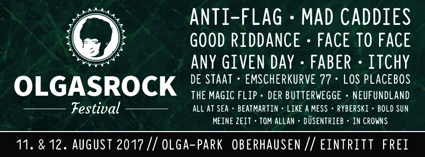 Seit dem Jahr 2000 findet das “Umsonst & Draußen” Musikfestival Olgas Rock jährlich m Olga Park in Oberhausen-Osterfeld statt. Zur 18. Ausgabe am zweiten Augustwochenende, genauer gesagt am 11. & 12.08.2017, werde auch in diesem Jahr wieder auf zwei Bühnen über 20 Bands und Künstler aus verschiedenen Musikrichtungen auftreten. Das Hauptaugenmerk liegt dabei auf Rock und Punk, vereinzelt finden aber auch Musiker aus dem Hip-Hop und Metal-Genre auf dem Festival ihren Platz