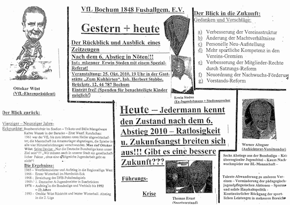 In Bochum gibt es offensichtlich nichts, was es nicht gibt. Mit einem Flugblatt, das in seiner fehlerhaften Zusammenstellung wohl einzigartig ist, lädt der frühere Jugendleiter und Stadionsprecher Erwin Steden, der sich selbst als Zeitzeuge bezeichnet, zu einer Diskussionsveranstaltung in eine Bochumer Kneipe ein. Steden, der einst den Klub über Nacht wegen zahlreicher „Verfehlungen“ verlassen musste, will einen Ausblick über den Ist-Zustand und die Zukunft des VfL geben. Ganz offensichtlich handelt es sich dabei um eine späte Retourkutsche gegen die derzeit Verantwortlichen.