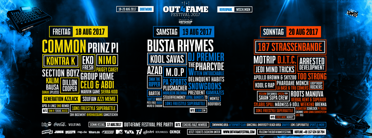 NRW’s größtes Hip Hop Festival Out4Fame fand von 2014 bis 2016 auf der Schwarzen Heide in Hünxe statt und wird vom 18. bis 21. August 2017 erstmals im Revierpark Wischlingen in Dortmund ausgetragen.
