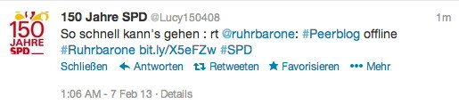 Aus den eigenen Reihen schlug dem Peerblog Hähme entgegen. Auf Twitter kommentierte 150 Jahre SPD: