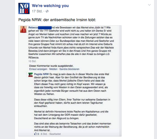 Pegida NRW antwortet auf den Beitrag von Rebecca: „ Es mag ja sein dass du in dieser Woche das erste mal davon gehört hast. Aber für den Großteil der Bevölkerung ist das schon lange klar, dass Merkel jüdische Eltern hatte und dass die Eltern dieser Frau nicht ganz richtig im Kopf waren.“ (Auch hier gilt: Die Fehler waren im Original schon so) Gegen Ende der Antwort schreibt Pegida NRW noch davon, dass Merkel „definitiv Hoeneckers letzte Rache am Kapitalismus“ sei und schreibt, Merkel habe „seit dem Untergang der DDR massiv dafür gearbeitet, Deutschland an den Abgrund zu bringen.“