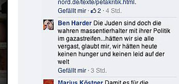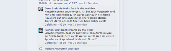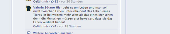 Auf Facebook findet die PR-Aktion von PETA nicht nur Zustimmung. Viele kritisieren, das PETA den Mord an den Juden auf eine Stufe mit der Herstellung von Wurstwaren stellt – aber es gibt nicht wenige, die PETAS menschenverachtende Sicht teilen: