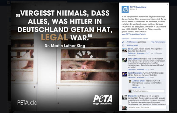 Schon wieder macht die Tierrechtsorganisation PETA PR mit der Vernichtung der Juden. Nachdem die Kampagne „Holocaust auf Ihrem Teller“ weltweit für Schlagzeilen sorgte und die entsprechende Ausstellung in Deutschland verboten wurde, wird nun ein Zitat aus einer Rede des Bürgerrechtlers Martin Luther King mißbraucht, um die Werbetrommel zu rühren. Immerhin geht es um viel Spendengeld. Der Mord an Millionen Juden durch die Nazis wird von PETA auf seiner Facebook-Seite auf eine Stufe mit dem Verzehr von Fleisch gestellt: