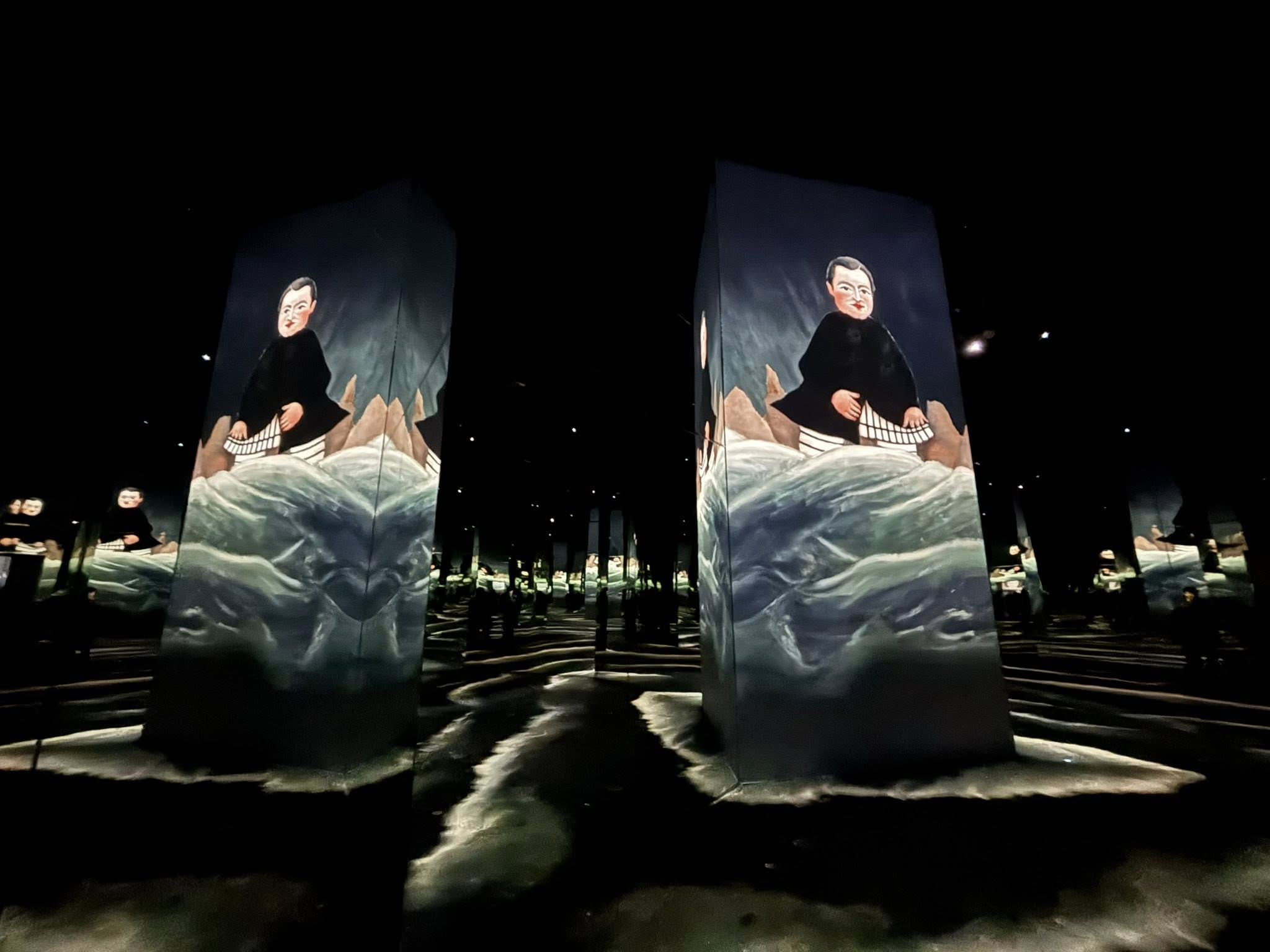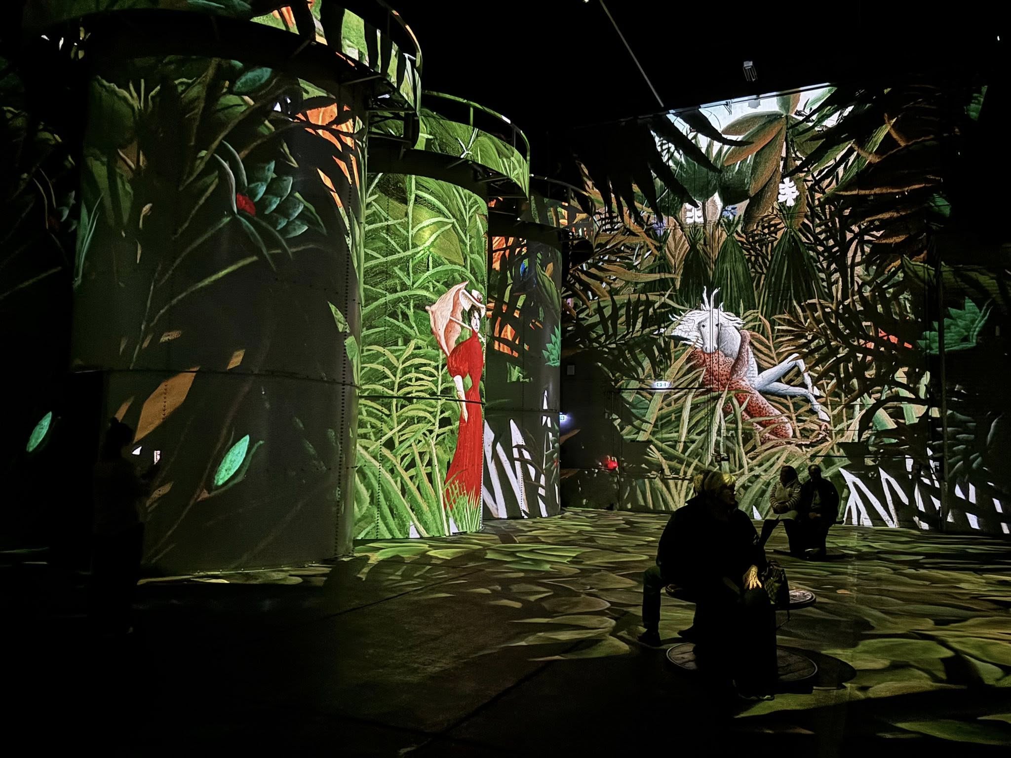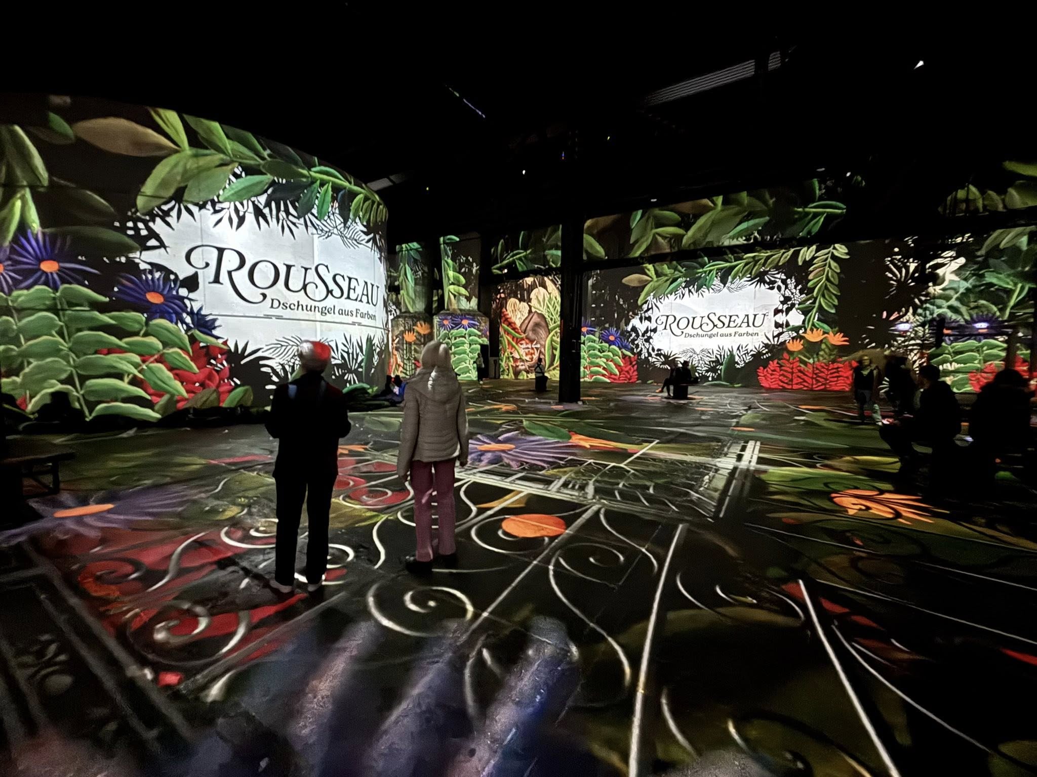 Der zweite Teil ist Henri Rousseau gewidmet. Seine farbenprächtigen, leicht surrealen Dschungelszenen wirken in der riesigen Projektion besonders intensiv. Plötzlich tauchen Palmen, exotische Tiere und geheimnisvolle Figuren um einen herum auf. Es ist eine fantasievolle, fast verspielte Welt – ganz anders als Monet, aber ebenso faszinierend.