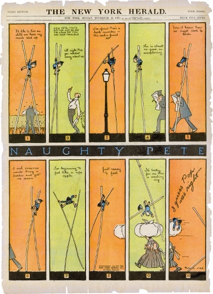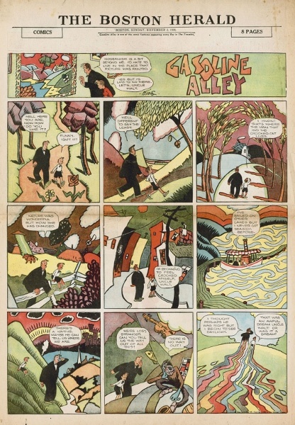 Erinnert wird hier auf rund 250 Seiten an Herrimans absurder Humor in Krazy Kat (ab 1913), die surrealistischen und expressionistischen Bildwelten von McCay (ab 1904) und Sterrett (ab 1912), Feiningers Comic-Serien für die Chicago Tribune (1906/07) sowie der über drei Jahrzehnte in Echtzeit erzählte Comic Gasoline Alley von King (ab 1921). Mit Forbells Gesamtkunstwerk Naughty Pete (1913) wird außerdem ein fast vergessener Zeichner vorgestellt. Einmal kurz lesen reicht da nicht. Dieses Buch wird man immer mal wieder zur Hand nehmen müssen und wollen um es als Leser wirklich möglichst voll auszuschöpfen.