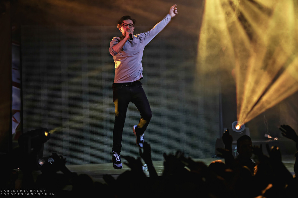Zusammen mit seinen Live-Musikern, die, nebem dem DJ-Pult auf einer aufwendig angelegten und mehrstöckigen Bühnen mit Videoprojektionen platziert waren, präsentierte Prinz Pi gestern Abend eine konstant energiegeladene Show und verstand es, die Stimmung seiner Fans durchweg auf einem hohen gut gelaunten und begeisterten Niveau zu halten.