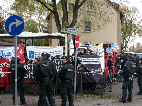 Ganz anders sahen das die Teilnehmer einer antirassistischen Demonstration, die um 12 Uhr vom Hamborner Rathaus aus nach Neumühl starteten. Die Demo blieb mit gut 300 Teilnehmern weit hinter den Erwartungen der Veranstalter zurück. Obwohl die antiziganistische (Rheinhausen) und rassistische (Neumühl) Stimmung weit über Duisburg hinaus derzeit in aller Munde ist, war die bundesweite Mobilisierung ein absoluter Misserfolg. Ein Grund dafür könnte sein, dass es an der Zusammensetzung der Organisatoren im Vorfeld deutliche Kritik gab. So reagierten einige Gruppen mit Unverständnis auf die Einbindung des Linkspartei-nahen Netzwerks gegen Rechts, dass bisher eher durch Solidarität mit dem faschistischen Assad-Regime, denn mit seinen Opfern aufgefallen war – die ja nun in Duisburg Zuflucht suchen. Die nächste Veranstaltung des Netzwerks, noch in zeitlicher Nähe zum 9. November, ist ausgerechnet ein Aufruf zum Boykott israelischer Waren.