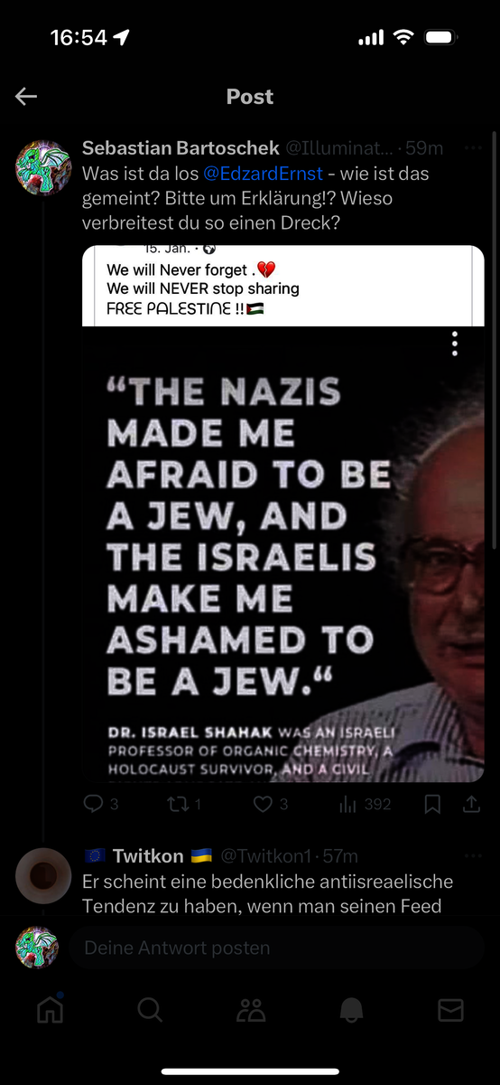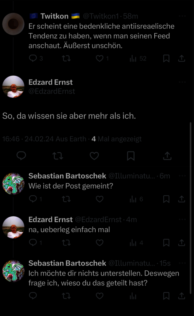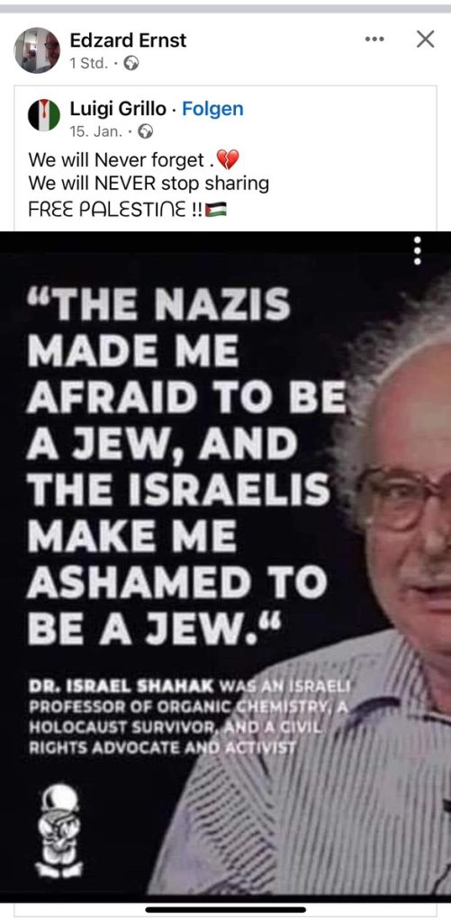 HINWEIS: der Autor dieses Artikels ist, wie Prof. Ernst auch, Mitglied der deutschen Skeptiker-Vereinigung GWUP. Dort tobt derzeit ein Kampf um die Ausrichtung des Vereins (Ruhrbarone berichteten); vorgeblich mit Blick auf das Thema Wokeness. Es gibt zudem auch einen Machtkampf im Wissenschaftsrat des Vereins, in dem Prof. Ernst Mitglied ist. Prof. Ernst steht auf Seiten der „Anti-Woken“ (wobei immer noch unklar ist, ob es überhaupt eine „woke“ Übernahme gab). Mich ordnet Prof. Ernst den „Wokies“ zu. Ich selbst tue es nicht. Für mich ist das Thema des Streits in der GWUP hier aber völlig nachrangig. Es geht um Antisemitismus.