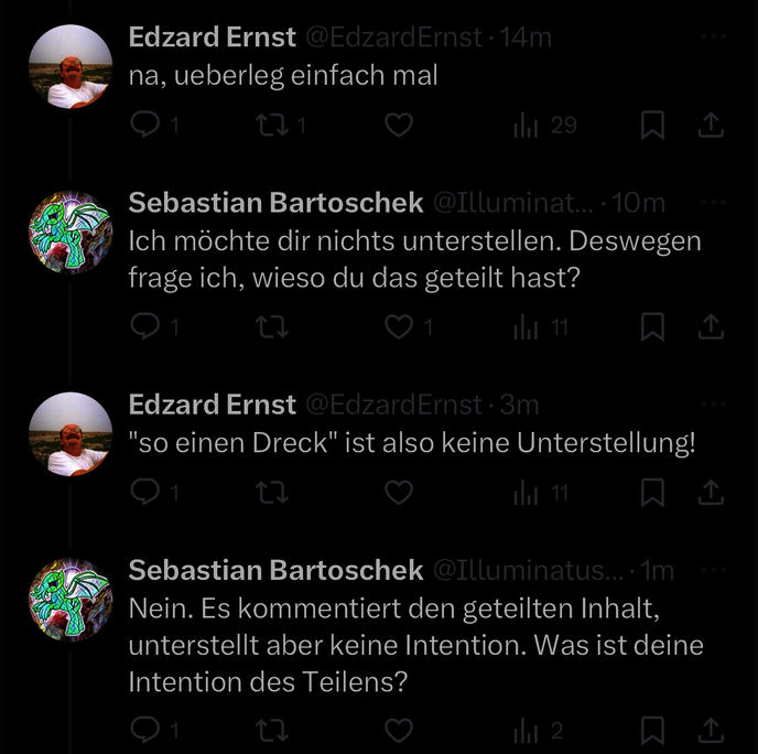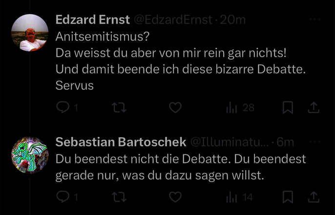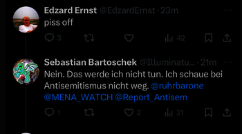 Noch mehr irritiert aber, dass jemand, der Skeptiker ist, und damit auch gegen Verschwörungserzählungen und Antisemitismus eintritt, sich wundert, wieso Nachfragen gestellt werden, und dann diese sogar als „Epressung“ bezeichnet.