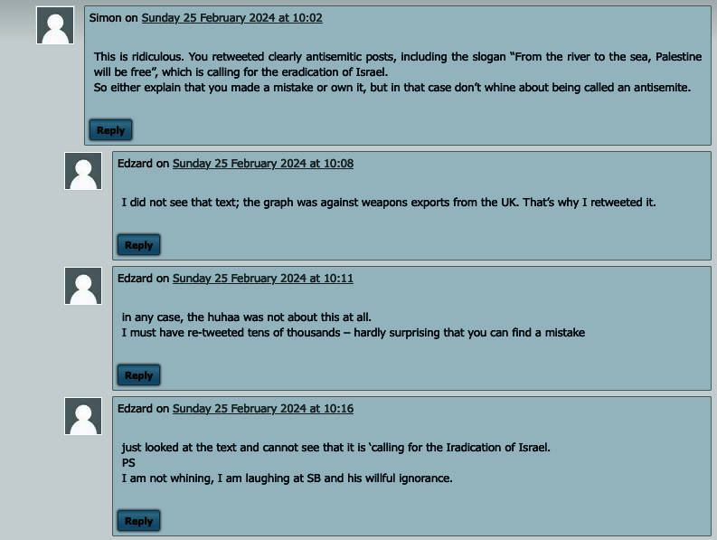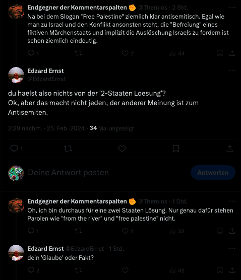 Auf das „From the river to the sea“-Ding ging Prof. Ernst indes in seinem Artikel nicht ein, worauf ihn auch – neben mir – ein Kommentar zu seinem Blogbeitrag hinwies. Seine Antwort darauf sei auch für mich maßgeblich, weswegen ich ihn hier zeige: