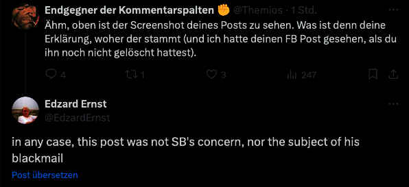 Mit Blick auf meine Stellungsnahme-Aufforderung schreibt Prof. Ernst davon, dass er sich „erpresst“ gefühlt habe. Er beschwert sich auch darüber, dass man die WELT auf seine Posts hingewiesen habe.