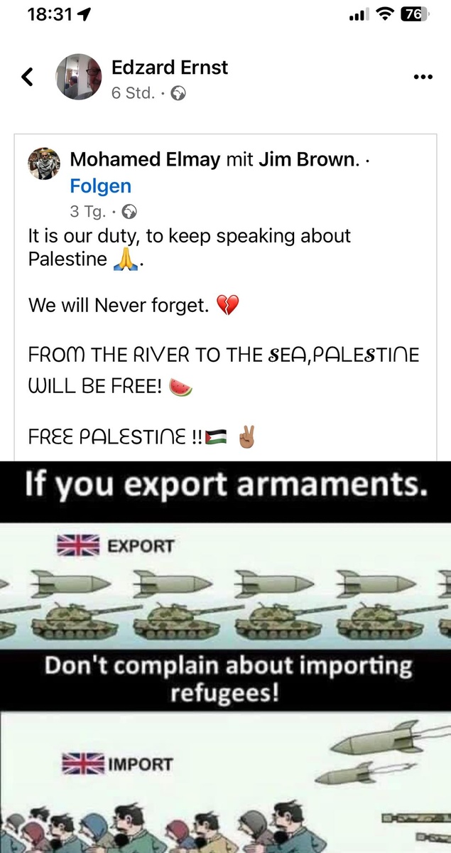 Ich wies Prof. Ernst darauf hin: „“From the River to the sea“ bezeichnet die von der Hamas propagierte 1-Staaten-Lösung bei Auslöschung aller Juden. Ist dir das nicht bekannt, oder stellst du es in Abrede?“ Hierauf kam dann nur Schweigen.