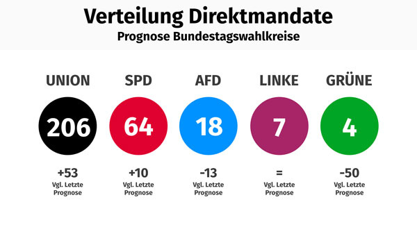 Auch die Wahlkreise teilen sich zurzeit CDU und SPD. Während die AfD nur mit dem Gewinn wenige Wahlkreise rechnen kann, können Direktkandidaten der Grünen zurzeit nicht damit rechnen, direkt in den Bundestag einzuziehen.