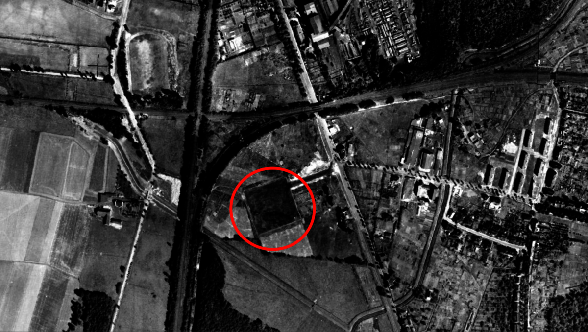 In den 1960ern ist die Struktur dann wieder nicht zu sehen. Allerdings ist hier wohl der mysteriöse Steinkreis zu sehen – im Luftbild am Ende des grünen Pfeiles.