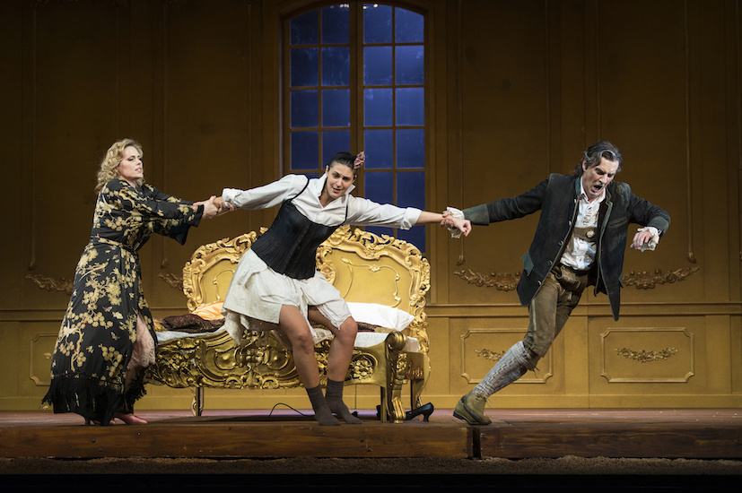 Es beginnt mit Octavian und der Marschallin in einem goldenen Rokoko-Bett vor glitzerndem Firmament. Ein perfektes Anfangsbild für das, was Herzog erzählen will und was auch Hofmannsthal und Strauß erzählen. Eine Geschichte von Zeit, ihrem langsamen und oft unmerklichen Vergehen und den plötzlichen, schmerzlichen Brüchen. Zunächst aber ist das Liebespaar ganz aus der Zeit geschleudert und treibt im endlosen wie ewigen Weltraum. Fast könnte die Rokoko-Optik des Bettes als eine Referenz auf die Schlusspassage von Stanley Kubricks „2001“ gelesen werden, in der sich der Astronaut Dave Bowman jenseits der Unendlichkeit in einem Rokoko-Salon wiederfindet. Der Rest der Inszenierung spricht allerdings dafür, dass diese Assoziation trügt und Bühnenbildner Mathis Neidhardt hier ganz schlicht die Handlung in der Zeit Maria Theresias verortet, in der auch Strauß und Hofmannsthal sie anlegten.