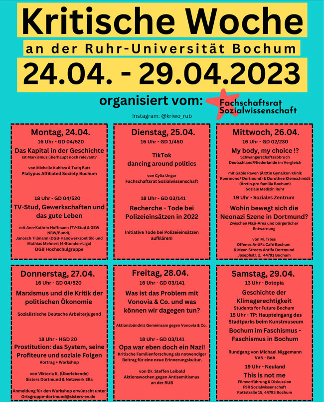 Die für 18 Uhr in der Ruhr Uni geplante Veranstaltung wird nicht stattfinden. Gestern erhielt Sisters Dortmund die Absage des Fachschaftsrats: „Der Fachschaftsrat Sozialwissenschaft versteht sich profeministisch und positioniert sich seit jeher gegen Rassismuss und Transfeindlichkeit. Aus verschiedenen Gründen sind wir zu der Entscheidung gekommen, die Veranstaltung der Sisters e.V. am kommenden Donnerstag, nicht stattfinden zu lassen. Wir befinden uns in einem internen Prozess der Auseinandersetzung. Wir verurteilen jegliche transfeindlichen, ableistischen, rassistischen und menschenfeindlichen Kommentare.“ Man bedauere die kurzfristige Absage.