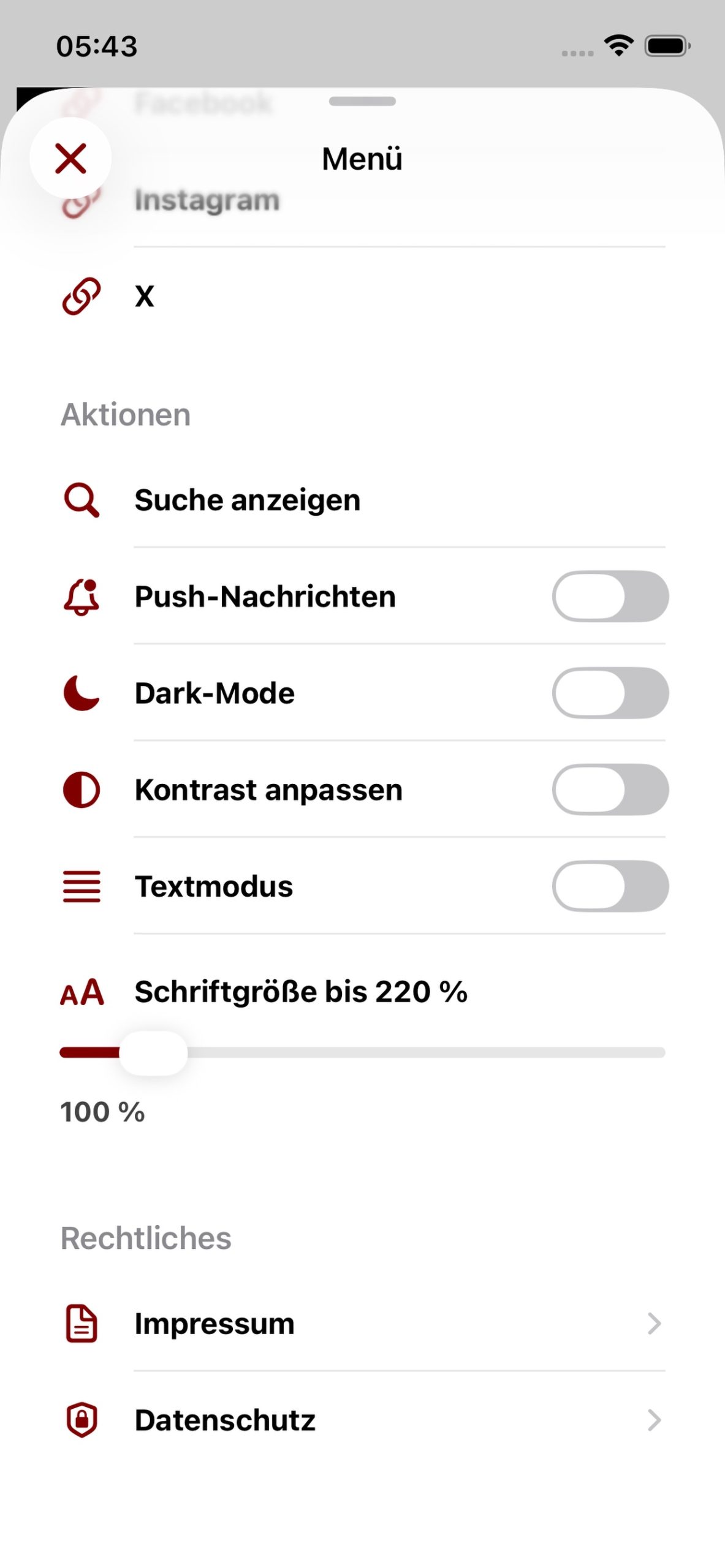 Das Menü auf der linken oberen Seite zeigt dir relevante Links an (Ruhrbarone.de und unsere Social-Media-Konten) und bietet dir eine Reihe von Aktionen: Du kannst ein Suchfeld aktivieren, über das du die App nach Stichwörtern durchsuchen kannst. Du kannst Push-Nachrichten aktivieren oder deaktivieren, um schnell über jeden neuen Beitrag im informiert zu werden. Es gibt die Möglichkeit einen Dark-Mode ein- und auszustellen: Um deine Augen – bei Dunkelheit – und den Akku deines iPhones oder iPads zu schonen. Die Schriftgröße kann auf 200% der Standardgröße eingestellt werden, der Kontrast ist anpassbar und es ist auch ein reiner Textmodus verfügbar.