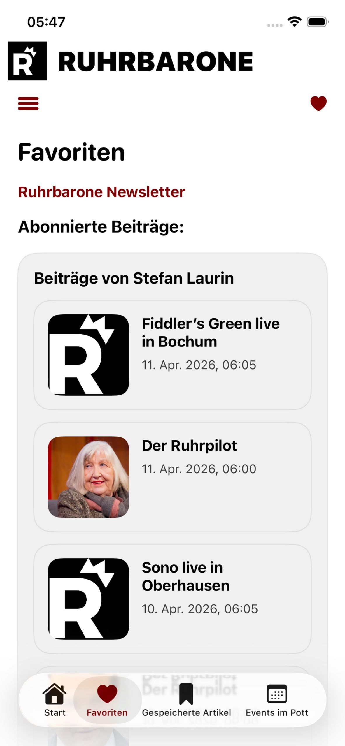 Das Menü unten beinhaltet vier Punkte. Das Home-Symbol bringt dich zurück zur Ursprungsseite der App. Unter „Favoriten“ findest du alle aktuellen Beiträge des von dir abonnierten Autoren (In unserem Beispiel: Stefan Laurin). Artikel, die zukünftig von den von dir abonnierten Autoren erscheinen, findest du hier ebenfalls nach der Veröffentlichung. Falls du auch via Email in unregelmäßigen Abständen über neue Beiträge informiert werden oder andere Infos der Ruhrbarone in deinem Postfach finden möchtest, kannst du in der App auch unseren Newsletter abonnieren.