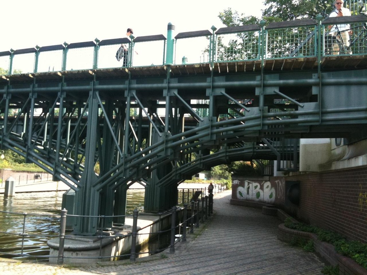Beim Weiterradeln geht auf unserer Seite des Ufers die Spree in den Landwehrkanal über. Irgendwann cruisen wir auf einer Brücke, nah unter uns die Rosa-Luxemburg-Gedenktafel. Ich gehe die Treppe nach unten, ein paar Meter den Weg entlang, bis die Tafel in Sicht kommt. Jemand hat krakelig darüber gesprüht. Die Schrift des Textes zur Ermordung Luxemburgs so klein, dass kaum jemand lesen dürfte (sollte?), was da steht.